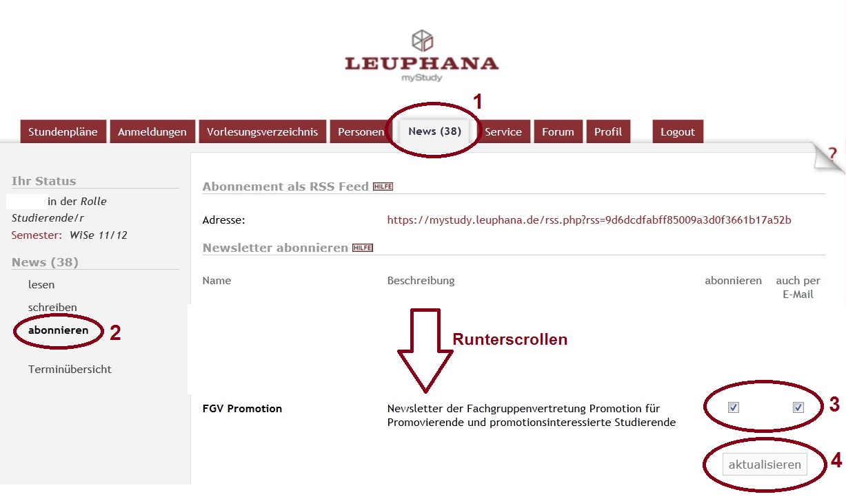 In myStudy unter News (1) --> abonnieren (2) wählen.
